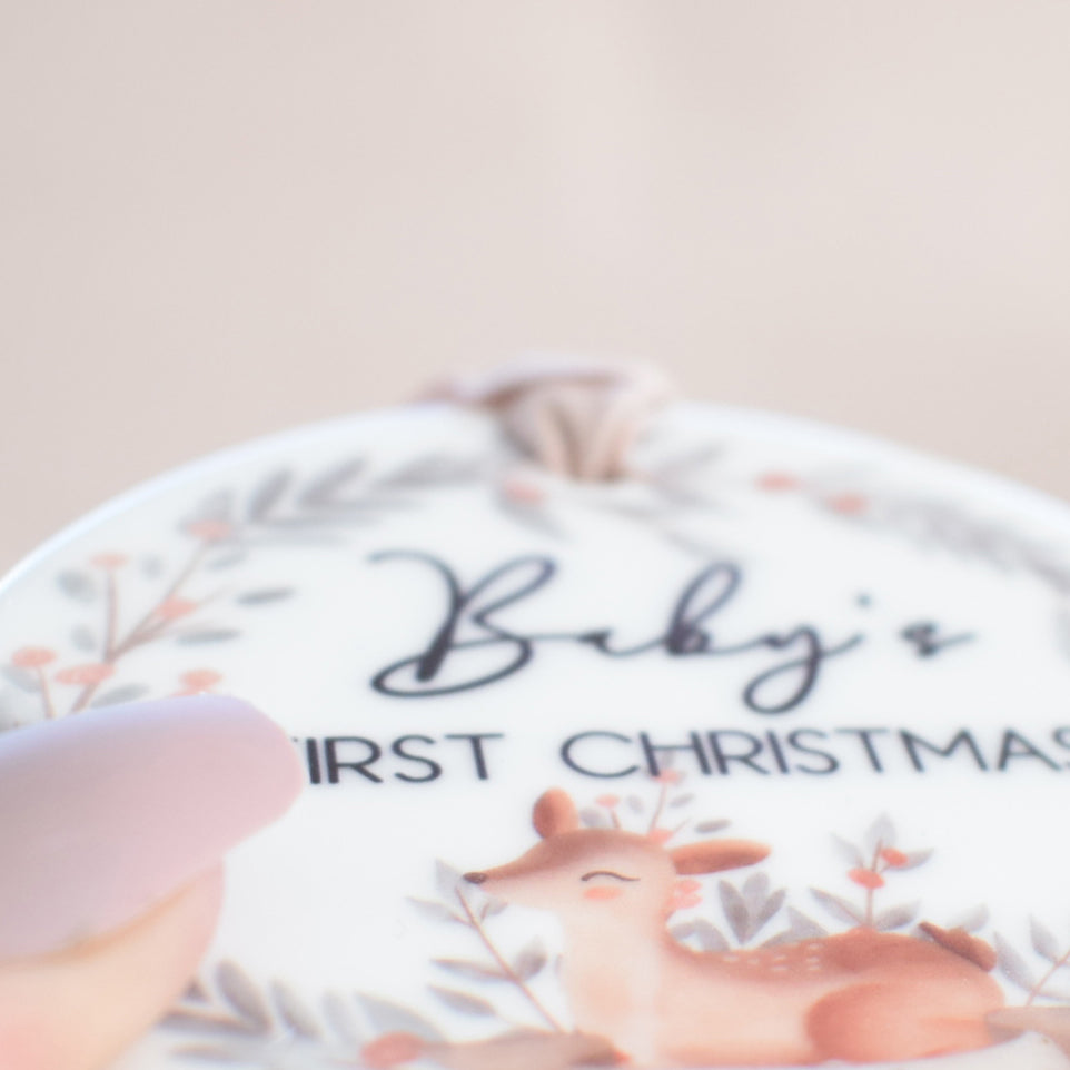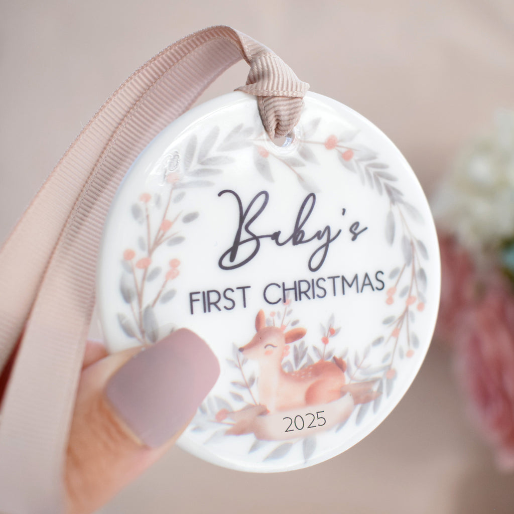 - This bauble features a traditional design that is so on trend at the moment whilst also being classy and timeless. It features such a cute deer design with a natural greenery wreath and complimenting fonts. Each bauble features the text as photographed.