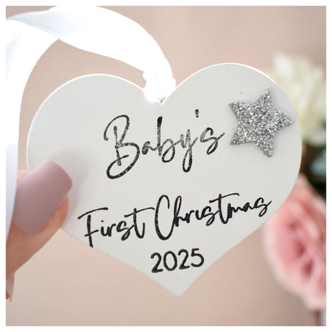 - This hanging decoration is a lovely painted white matte finish with a 3D silver glitter star embellishment. It is designed to match any decor whilst also being a classy and timeless design. Each bauble features the text as pictured in modern complimenting fonts.