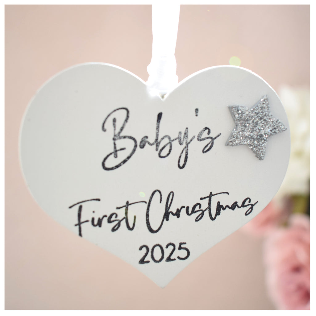 Baby's First Christmas 2025 White Wood Heart Decoration