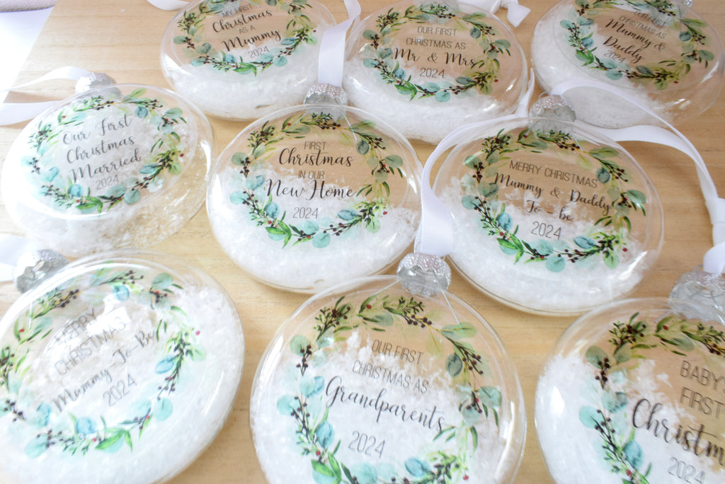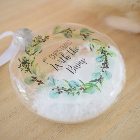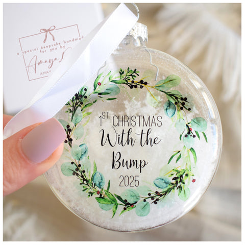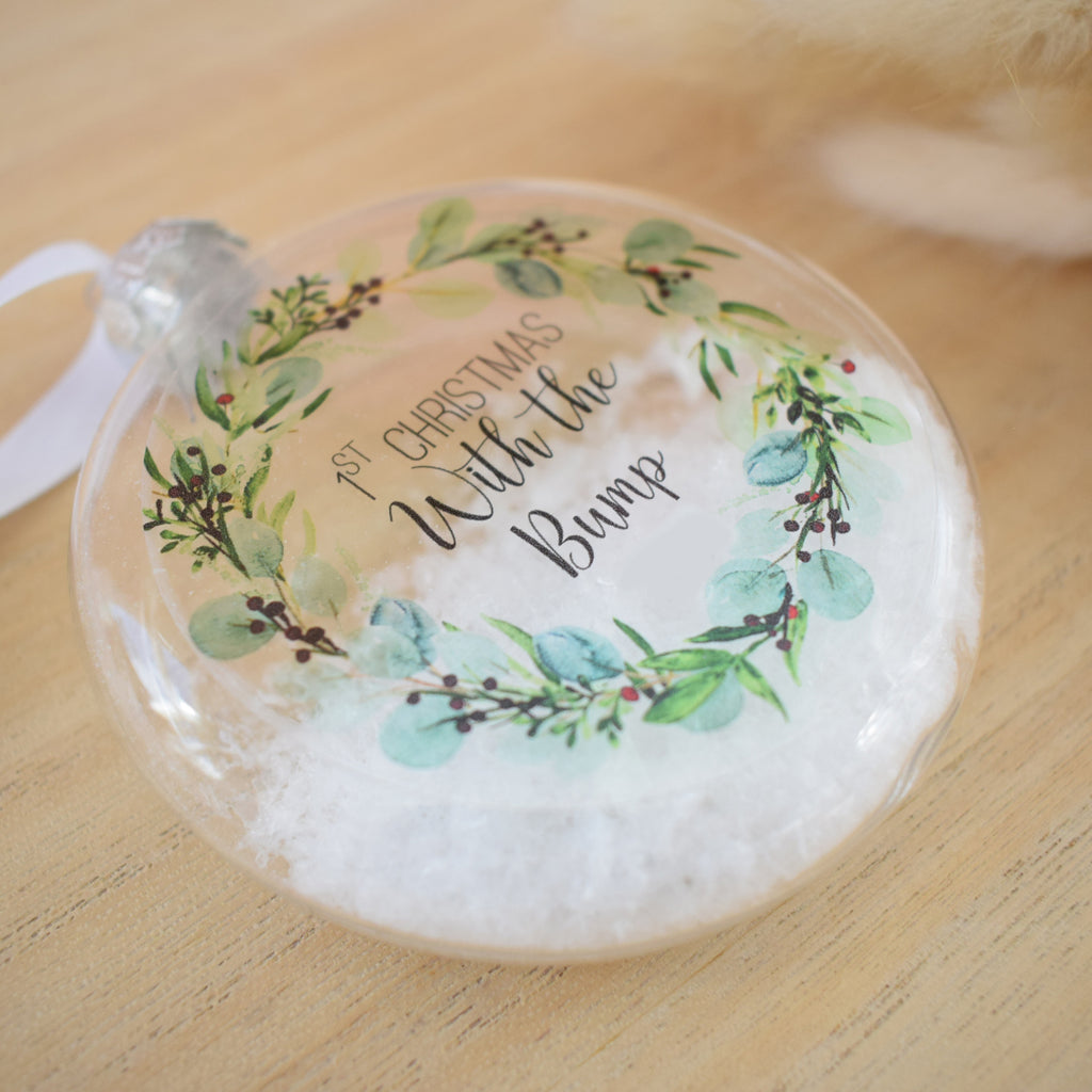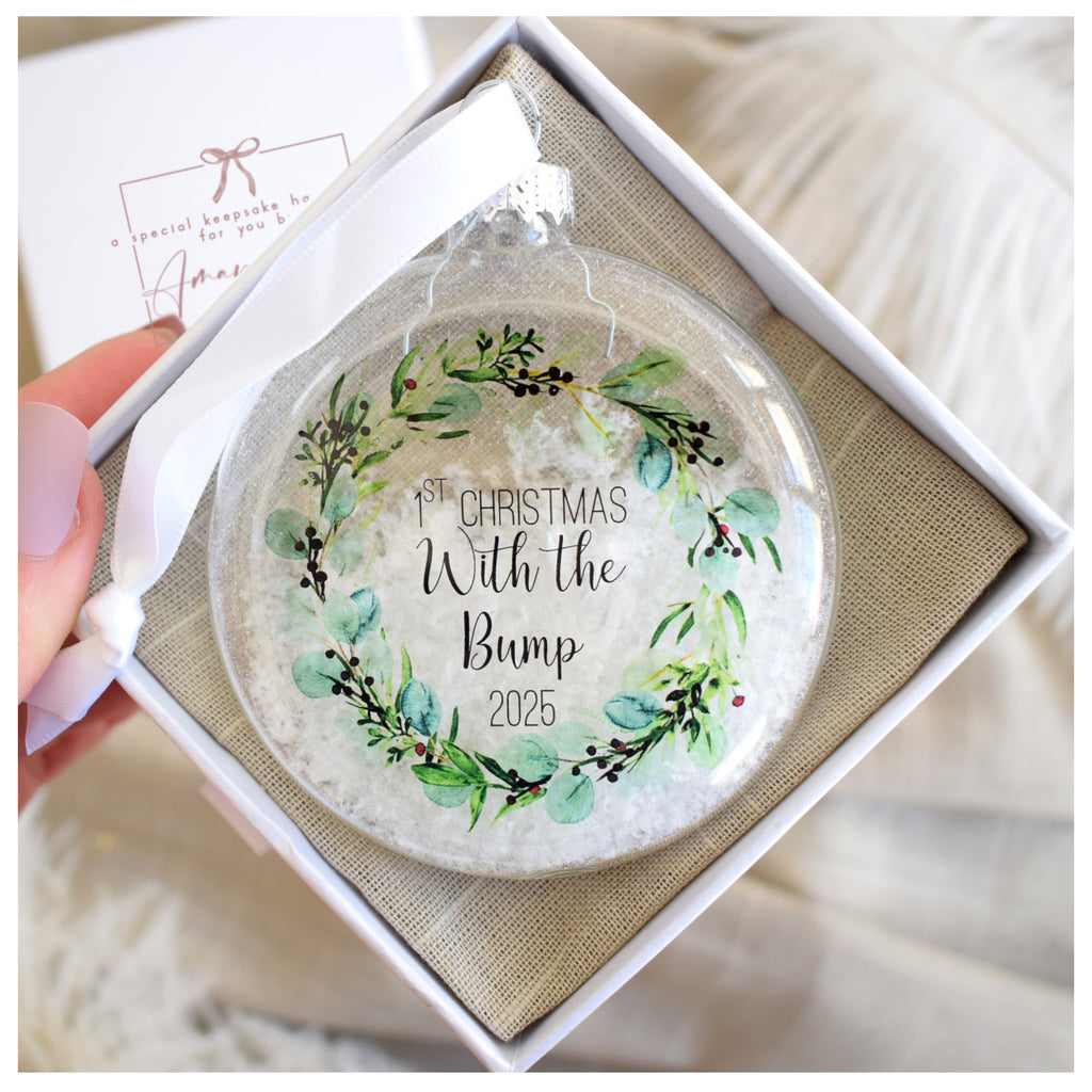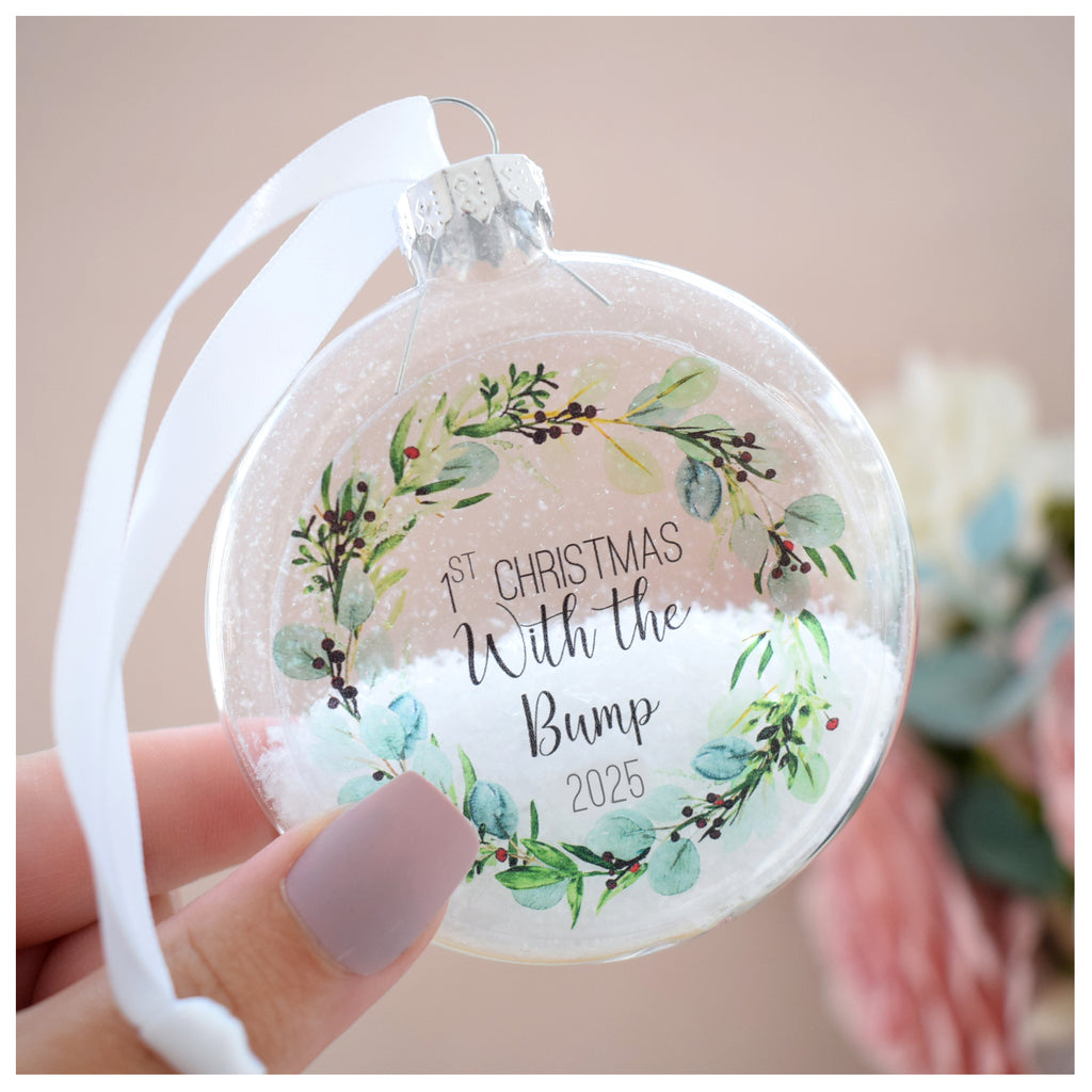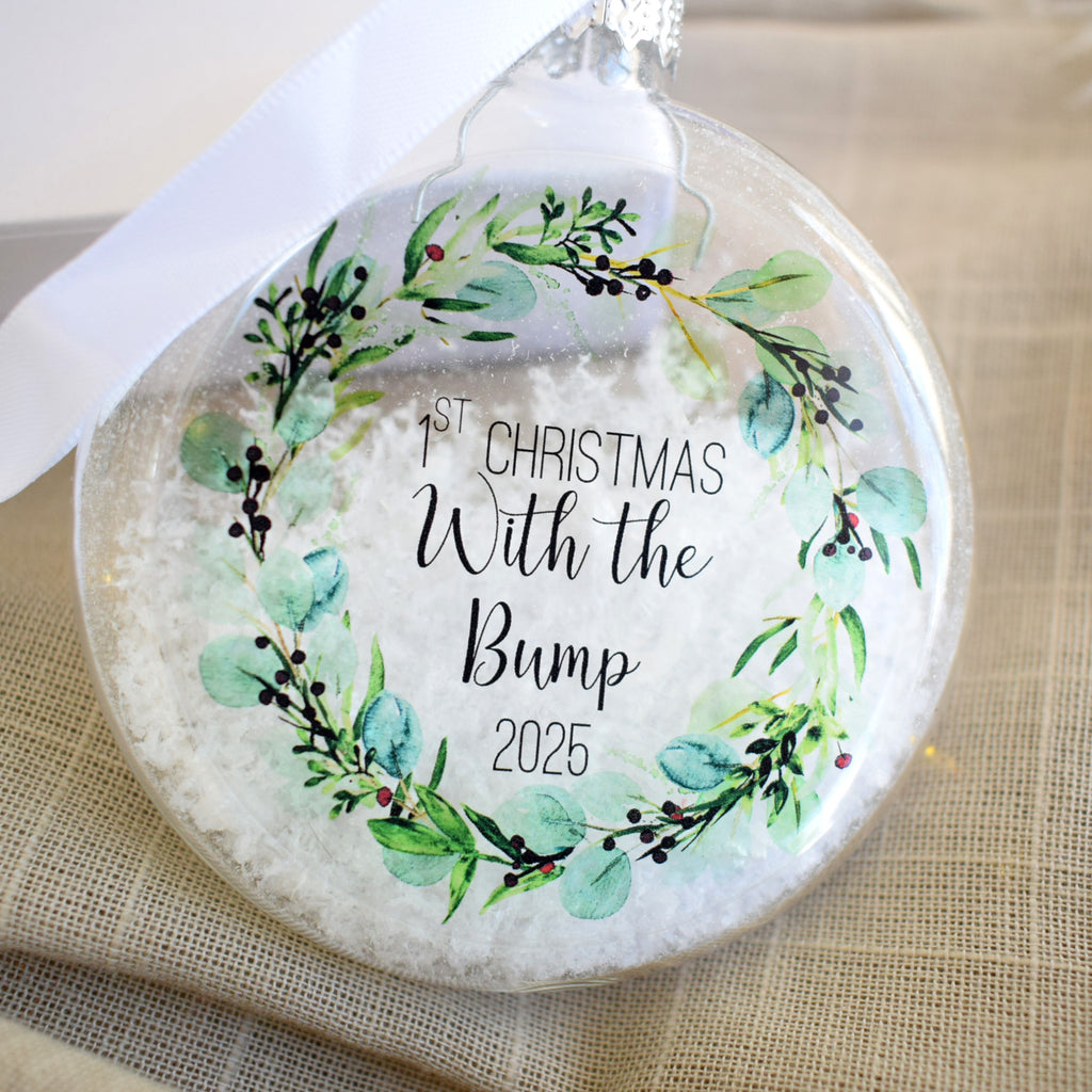 - This bauble features the image of a festive eucalyptus and berry wreath on it which is so on trend at the moment whilst also being a classy and timeless design. Each bauble features the text "First Christmas With The Bump 2025"