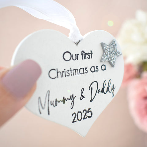 - This hanging decoration is a lovely painted white matte finish with a 3D silver glitter star embellishment. It is designed to match any decor whilst also being a classy and timeless design. Each bauble features the text as pictured in modern complimenting fonts.