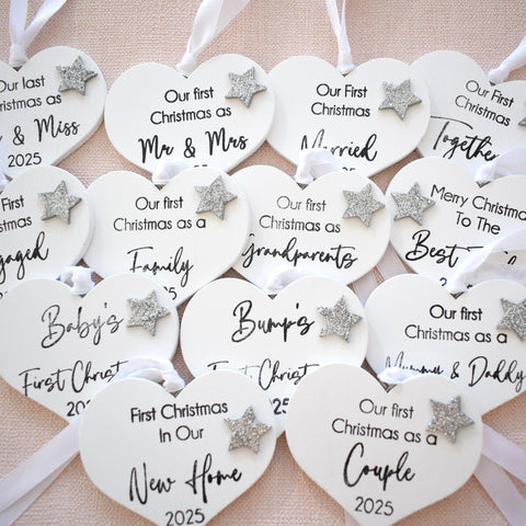 - This hanging decoration is a lovely painted white matte finish with a 3D silver glitter star embellishment. It is designed to match any decor whilst also being a classy and timeless design. Each bauble features the text as pictured in modern complimenting fonts.