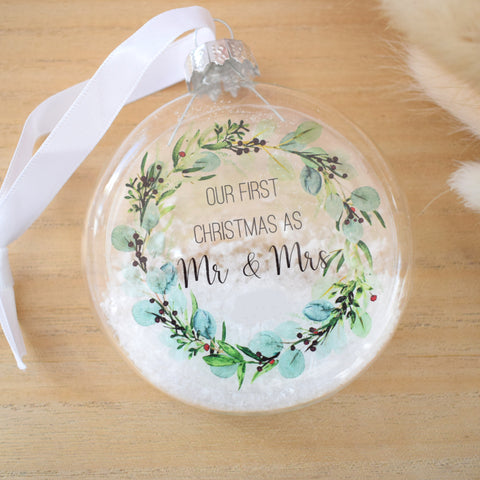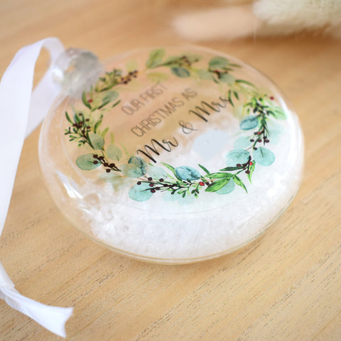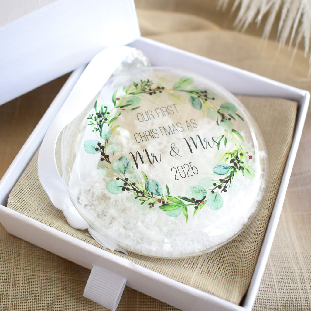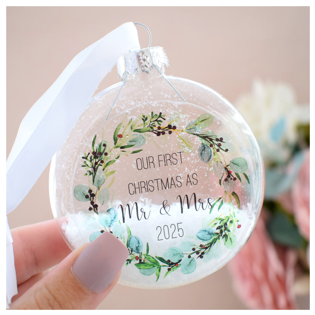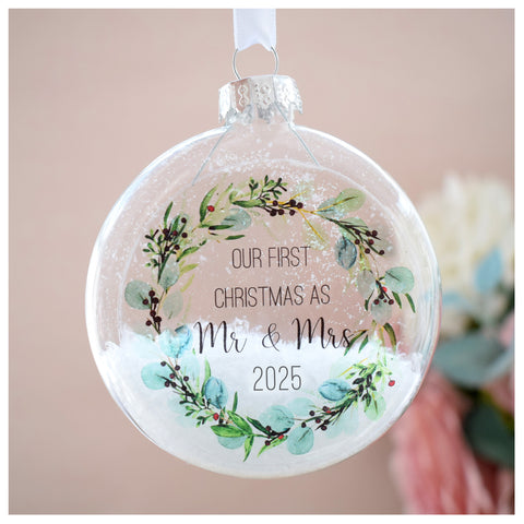 - This bauble features the image of a festive eucalyptus and berry wreath on it which is so on trend at the moment whilst also being a classy and timeless design. Each bauble features the text "Our First Christmas as Mr & Mrs 2025”.