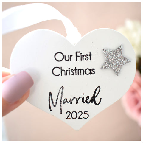 Our First Christmas Married 2025 White Wood Heart Decoration