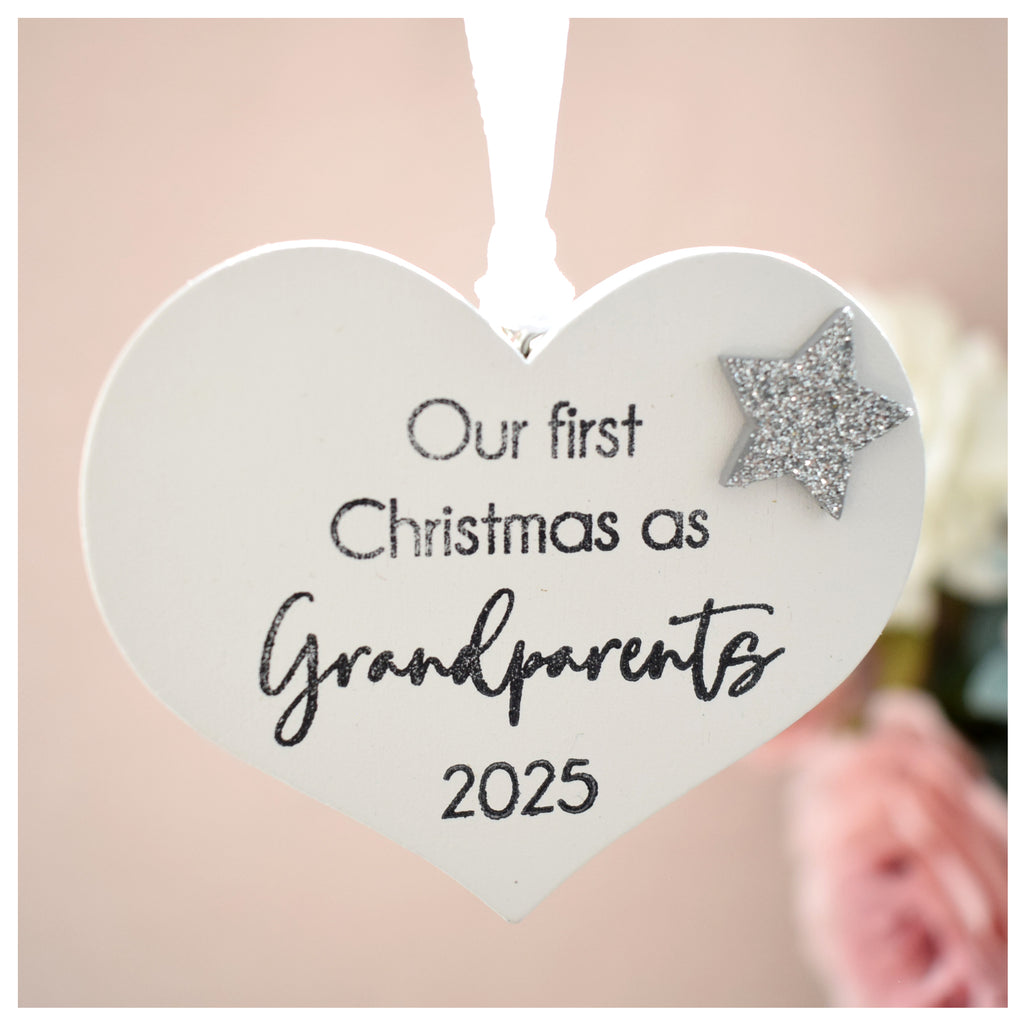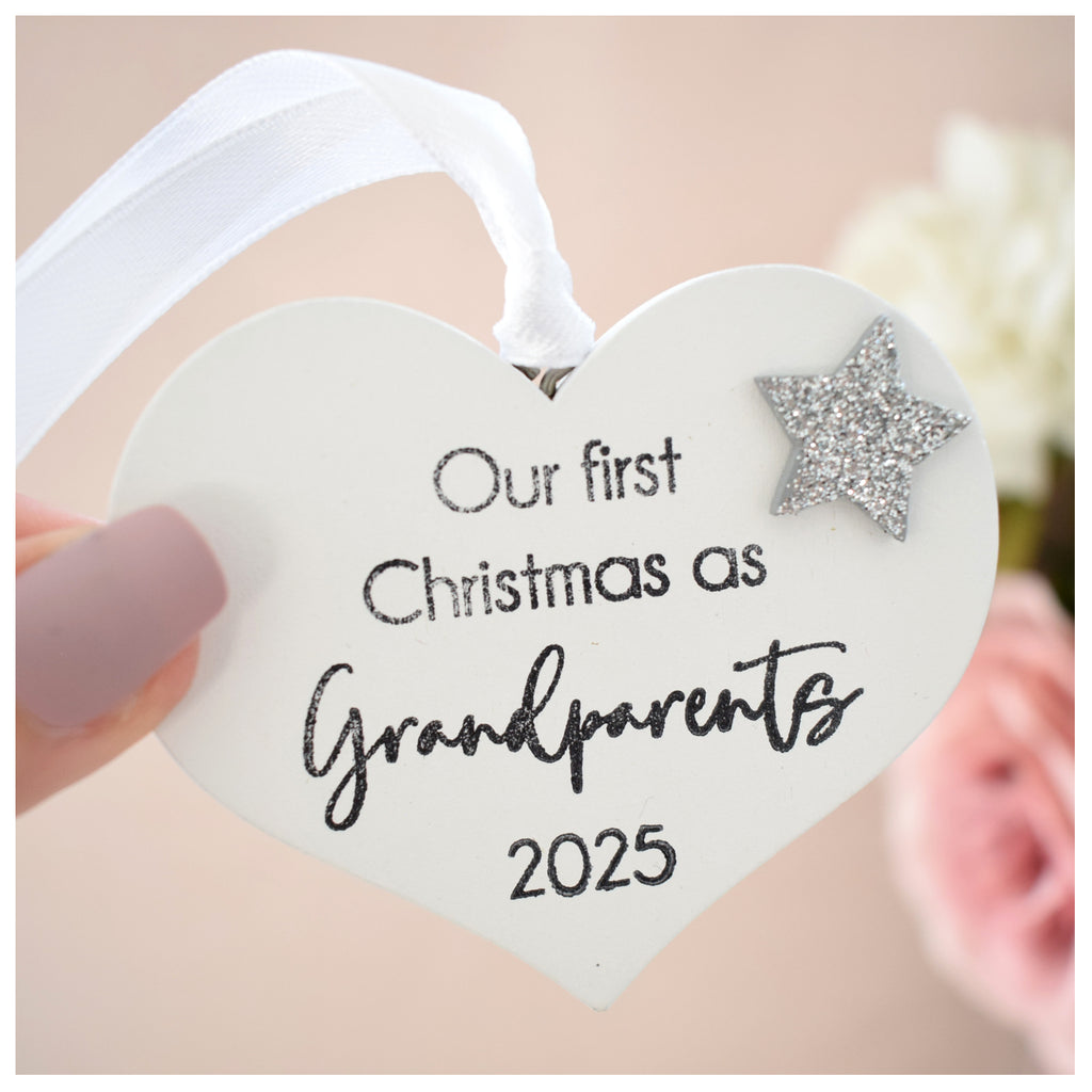 - This hanging decoration is a lovely painted white matte finish with a 3D silver glitter star embellishment. It is designed to match any decor whilst also being a classy and timeless design. Each bauble features the text as pictured in modern complimenting fonts.
