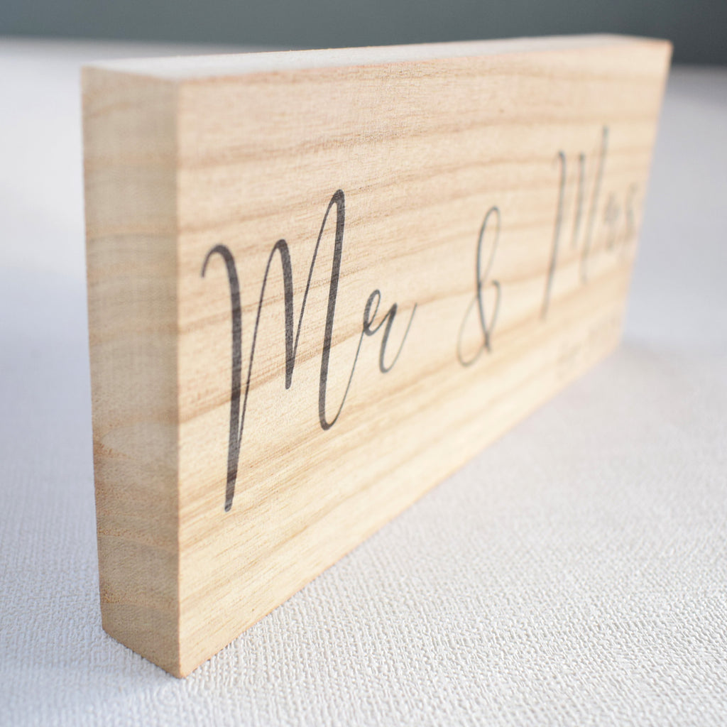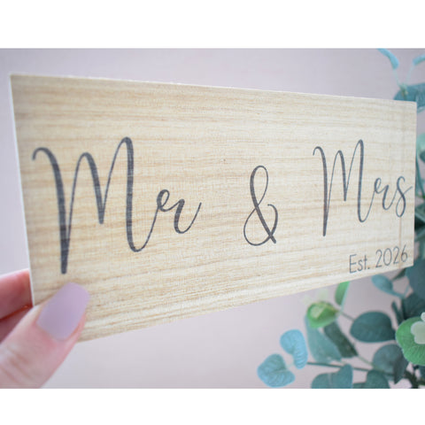 This wooden plaque decoration is a lovely Paulownia wood, it is a high quality solid wood, not veneer or wood print. Paulownia is an absolutely stunning wood, it is has a lovely grain and is very eco friendly as is the fastest growing hardwood. This plaque has very modern and sleek fonts for the wording "Mr & Mrs Est 2026". The plaque is unvarnished so as to keep the rustic matte look.