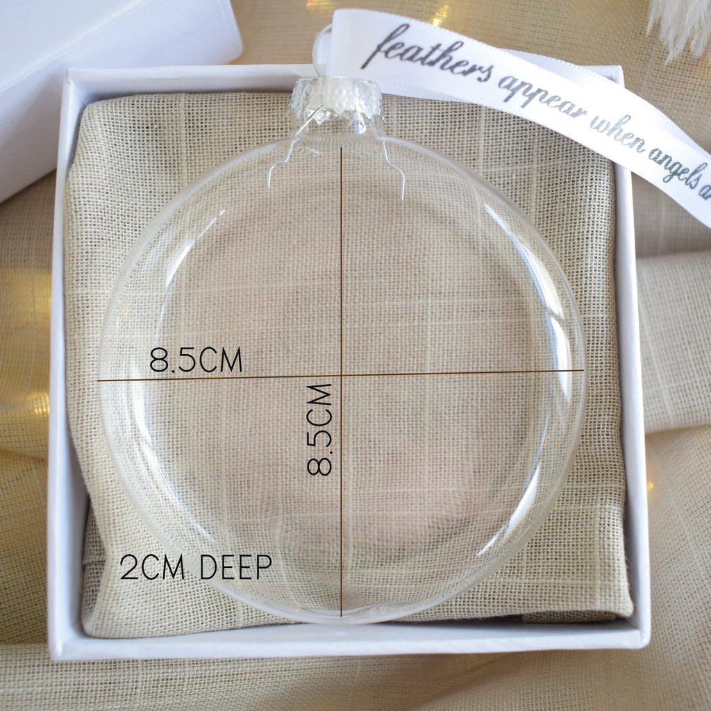 Each bauble is 8.5cm wide/high x 2cm deep (not a globe shape, it is flatter), Round shaped glass bauble which is threaded with an approx 8cm long white satin ribbon.