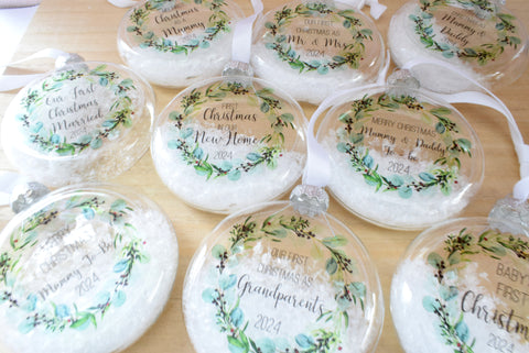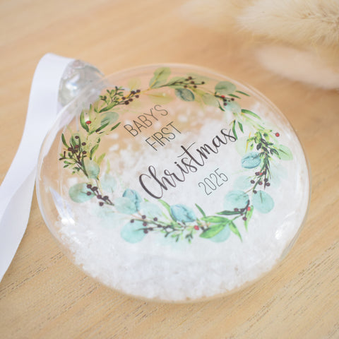 - This bauble features the image of a festive eucalyptus and berry wreath on it which is so on trend at the moment whilst also being a classy and timeless design. Each bauble features the text "Baby's First Christmas 2025"