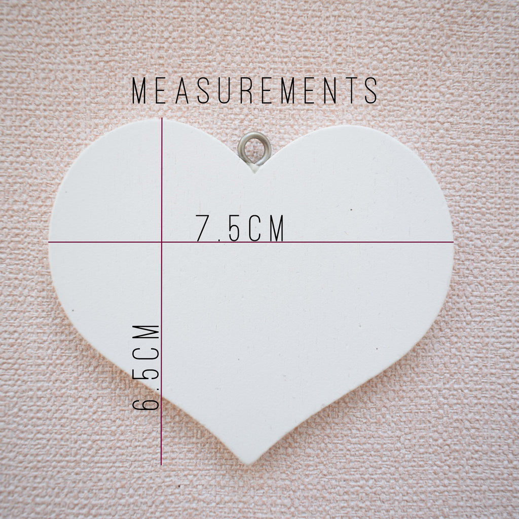 Each bauble is 7.5cm wide, 6.5cm high x 0.5cm deep (photographs show the measurements), Heart shaped white wooden bauble which is threaded with an approx 8cm long white satin ribbon through the affixed eyelet. I leave this white ribbon untied for you (as in the photographs) so that you can tie your knot at your desired height for your tree or tie this to gifts as a gift tag.